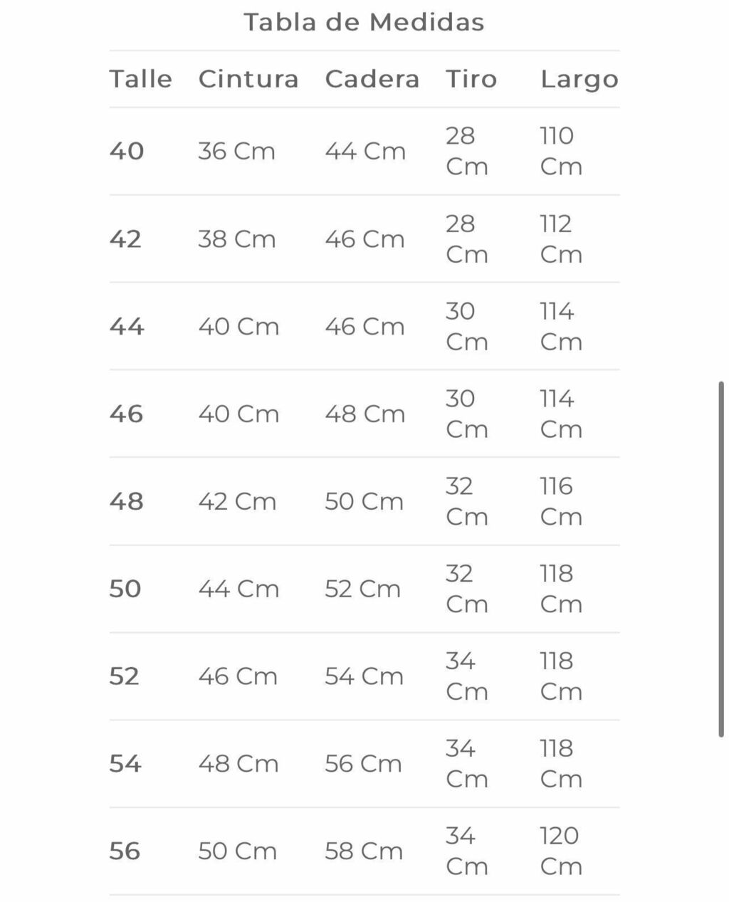talles del 40 al 56
